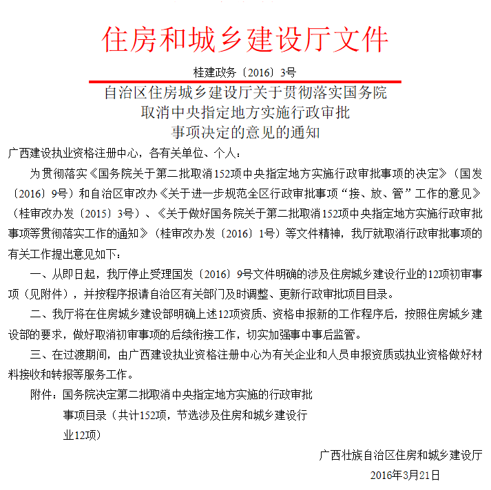 | 135 | 對住房城鄉(xiāng)建設部負責的一級注冊建造師執(zhí)業(yè)資格審批的初審 | 省級住房城鄉(xiāng)建設部門 | 《注冊建造師管理規(guī)定》(建設部令2006年第153號) |