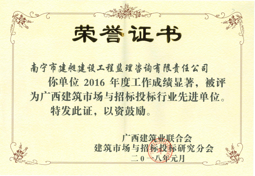 熱烈祝賀我公司再次榮獲“廣西建筑市場(chǎng)與招標(biāo)投標(biāo)行業(yè)先進(jìn)單位”榮譽(yù)稱號(hào),從2011年起已連續(xù)6年榮獲此殊榮。同時(shí)還有3位同志榮獲“廣西招標(biāo)投標(biāo)代理機(jī)構(gòu)先進(jìn)個(gè)人”稱號(hào),向他們表示祝賀。